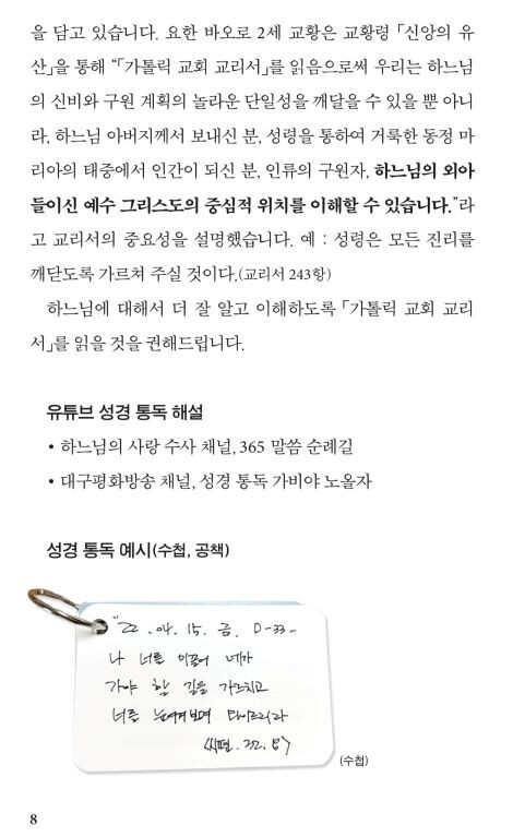 공책과 수첩 사진을 주 5일 단톡방에 나누고 한 달에 한 번 나눔을 하면서 1년 반 동안 통독하는 방식입니다. 1년 반이 지나면 신약성경 해설서를 통한 통독 심화 과정도 이어서 할 수 있습니다. 한 본당 신자분들이 모임을 시작한다면 주임 신부님의 허락을 받고 시작합니다.
