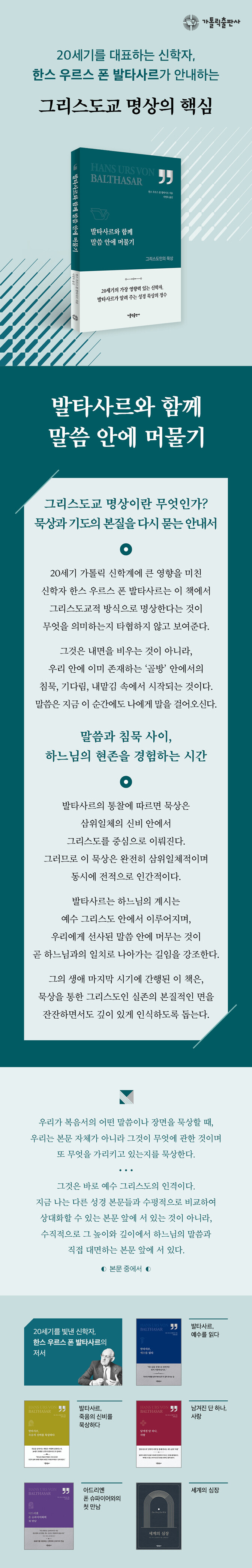 마음의 균형을 잃기 쉬운 오늘날, 묵상은 현대인들의 마음을 가다듬고 삶의 방향을 찾을 수 있도록 도와준다. 그러나 묵상은 ‘성경 구절을 읽고 잠시 기도하는 개인적인 영성 시간’이 아니다. 신앙생활에서조차 묵상이 차지하는 자리가 점점 좁아지는 요즘, 그리스도인의 묵상의 참된 의미를 《발타사르와 함께 말씀 안에 머물기》가 소개한다.