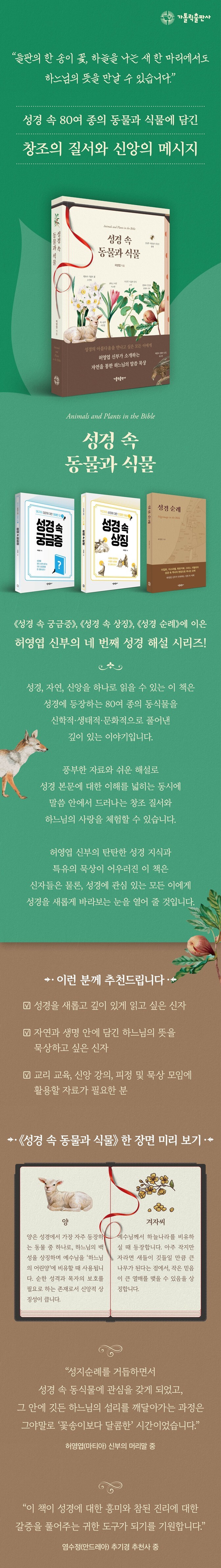 《성경 속 동물과 식물》은 성경에 나오는 동식물의 상징적 의미를 새롭게 발견하고, 이를 통해 하느님의 메시지를 이해하도록 돕는다. 포도, 올리브, 무화과 등 친숙한 식물부터 독수리, 돼지, 비둘기처럼 특별한 의미가 담긴 동물까지, 이 책은 ‘성경 속 동식물의 작은 사전’이라 해도 과언이 아니다. 베드로의 회개와 연관이 있는 수탉, 속죄 제물로 쓰인 염소, 믿음에 비유되는 겨자씨 등 70여 종의 동식물을 다룬다.