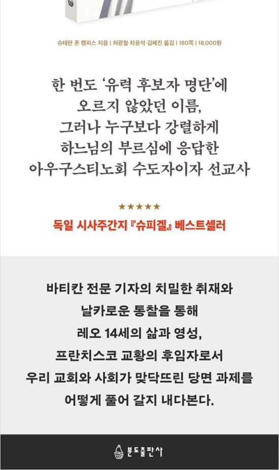 바티칸 베테랑 기자가 선교사에서 교황이 된 레오 14세를 입체적으로 그려 낸다. 어린 시절부터 페루의 오지를 두 발로 찾아다니던 선교사 시절 그리고 교황 선출에 이르기까지 그의 인생을 이끈 가치관과 신념을 살펴보면서, 그가 앞으로 교회를 어떤 방향으로 이끌지 전망해 본다. 기자 특유의 간결하고 현장감 있는 문체와 함께 수록된 많은 컬러 사진은 지루할 틈 없이 레오 14세가 어떤 인물인지 생동감 있게 전해 준다. 바티칸의 숨겨진 이야기를 흥미롭게 들여다보는 이 책은 우리 교회가 직면한 교회적・사회적 과제를 그와 교황청이 어떻게 풀어 나갈지 기대하게 한다.