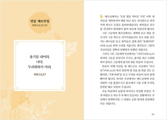 또한 이 책은 교회 전례력에 충실히 따라가며, 말씀을 통해 한 해를 따라가도록 도와준다. 주일마다 새로운 말씀을 접하고, 그 말씀 안에서 삶의 방향과 힘을 얻는 기쁨을 선사한다. 전례력으로 새해가 시작되는 대림시기(2025년 11월 30일)부터 성탄시기, 연중시기, 사순시기, 부활시기는 물론, 대축일, 기념일에 맞는 복음 말씀과 묵상 글을 읽고 묵상하며 기도를 바칠 수 있다. 이처럼 이 책은 1년 52주 동안 매 주일 복음을 묵상할 수 있도록 이끌어 주어, 이 책을 읽으며 묵상하다 보면 늘 주님 곁에 더욱 가까이 머물며 복음 말씀을 생활 안에서 체험하고 녹여 낼 수 있을 것이다.