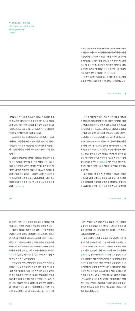 그리스도인들이 그리스도를 따라 걷는 영적 수행의 길에서 ‘단식’은 ‘기도’, ‘자선’과 더불어 검증된 수단이다. 교회는 처음 세워질 때부터 단식 수행을 익히 알고 실천했으며, 이미 초세기에 이에 대한 규칙도 마련해 두었다. 예컨대 그들은 예수의 붙잡히심과 십자가에 못 박히심을 기억하여, 수요일과 금요일을 단식일로 정했다. 그러나 근대에 들어서며 단식 규칙은 갈수록 축소되어 거의 무의미해졌다. 지난 수십 년간 교회는 단식이란 전통을 그저 외형적으로 유지했을 뿐, 그 의미는 점점 망각했다. 이 책은 단식이란 것이 죽은 전통이 아닌, 오늘날도 그 무엇보다 유효한 도구임을 일깨운다.