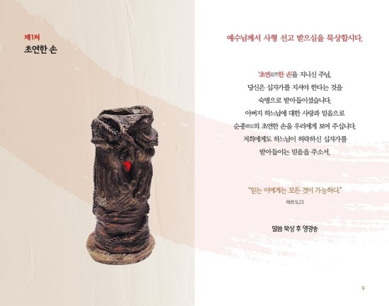 이경희 작가의 테라코타 작품과 『십자가를 품다』 함께 묵상하는 십자가의 길 기도서이다. 글은 이경희 에드부라가 작가와 나영훈 안토니오 신부가 함께 썼다. 이 『십자가를 품다』는 예수님께서 하느님 아버지의 뜻이 이루어지기를 바라시며 사형 선고를 받으신 제1처 ‘처연한 손’에서 시작되었다고 한다. 그리고 책임이나 의무처럼 십자가를 짊어지는 것에서 나아가, 품속에 넣거나 가슴에 끌어안는 ‘품다’라는 의미를 알아 가는 작업 과정이 행복하였다고 작가는 소회를 전한다. 받아들이고자 하는 일은 그만큼 힘든 일이지만 끝까지 할 수 있는 힘과 결실도 함께 주신다는 것을 14처 작품이 완성될 때 경험하게 해 주신 주님의 은총이었다.. 기도하며 만들어진 십자가의 길 한 처 한 처를 묵상하며 걷다 보면 하느님의 은총 안에서 예수님의 수난과 고통, 깊은 사랑과 행복을 모든 신앙인에게 힘이 되어 지길 희망합니다 [조형 예술학 박사 이경희 에드부르가]