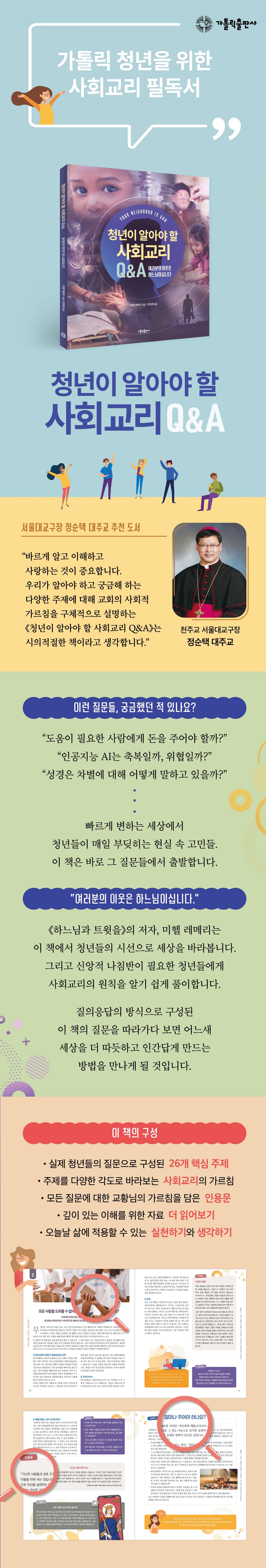 《청년이 알아야 할 사회교리 Q&A》는 사회교리를 추상적인 이론이나 교회 문헌의 요약으로 제시하지 않는다. 성경과 교회의 전통, 교황들의 가르침을 바탕으로, 가난과 연대, 정의와 평화, 노동과 경제, 정치와 국가, 기술과 생명이라는 현실의 질문 속에서 이웃을 통해 우리에게 다가오시는 하느님을 발견하도록 독자를 이끈다.